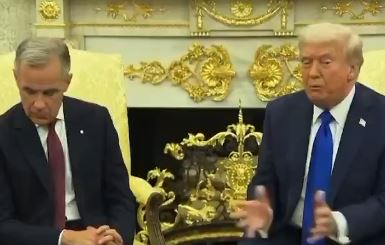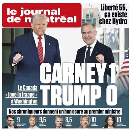 Trump n'a eu que des éloges pour Mark Carney, quel flatteur, une vraie chanson d'amour, bref il lui a dit : "C'est un leader de classe mondiale. C'est un homme qui sait ce qu'il veut. Et je ne suis pas surpris de voir qu'il a gagné l'élection et l'a remportée largement. C'est un homme bien. Il fait un excellent travail et c'est un négociateur coriace." "C'est un excellent Premier ministre. Je veux dire, il pourrait me représenter à tout moment. C'est un leader très fort, très bon."«grand homme d'État, great man», un journaleux à demandé pourquoi il n'y avait pas encore d'accord malgré le fait que Carney soit un ("great man") et sur un ton humoristique : "Parce que moi aussi je veux être un grand homme !" ("Because I want to be a great man too !"), bref c'était simplement pour le ridiculiser ?