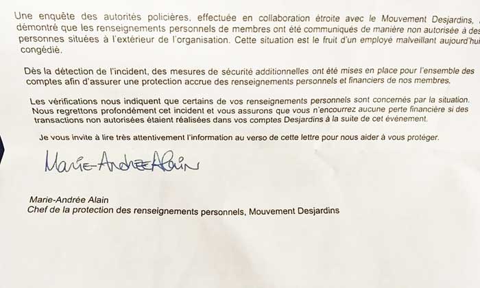 J’ai porté plainte à la GRC. J’ai appelé chacune des institutions financières figurant à mon dossier de crédit suite à la fraude pour demander que les transactions soient retirées de mon dossier de crédit. Je me suis plaint à Postes Canada. J’ai communiqué avec Services Canada pour savoir quoi faire pour la fuite de mon NAS. J’ai passé des heures en attente et à expliquer ma situation à des dizaines de téléphonistes qui se donnaient le relai, j’ai été transféré plus de fois que je ne peux les compter et j’ai écouté tout ce qui a été enregistré de musique d’ascenseur et de piano Nouvel-Âge. J’ai perdu plusieurs journées de ma vie et j’ai senti ma pression artérielle atteindre des sommets. Et j’ai finalement contacté Desjardins, parce que j’y ai des comptes et des cartes de crédit depuis plus de 40 ans et pour m’assurer que rien de douteux n’y figurait. On m’a dit qu’on prenait ma situation en note, de ne pas m’inquiéter et d’appeler la police et les agences de crédit. J’ai raccroché, rassuré de me savoir en sécurité. Puis j’ai ouvert la télévision et appris la fuite de renseignements personnels qui affectait Desjardins, son ampleur, les conséquences qu’elle pourrait avoir et les actions que promettaient de prendre ses dirigeants pour aider leurs clients. Et j’ai finalement compris ce qui s’était probablement passé.