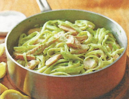 2. Versez la crème fraîche et le pesto dans la casserole. Portez à ébullition, ajoutez les pâtes et mélangez délicatement. Ajoutez les morceaux de saumon. Assaisonnez puis mélangez.