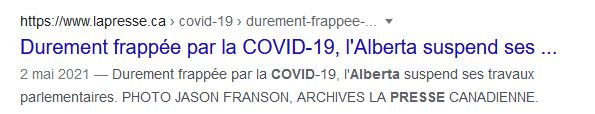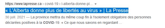 Voilà l'article de La Presse : « L'Alberta donne plus de libertés au virus » | La Presse cet article à pour but de traiter les Albertains de complotistes, rien de moins c'est de la cochonnerie à 100%.  Un article pondu par le petit nouveau journaleux Henrie Ouellette-Vézina qui doit donner la papatte à ses maîtres.