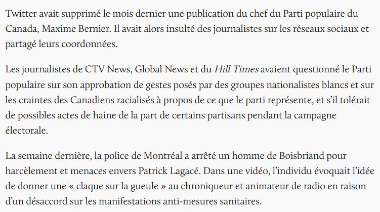 Voilà un exemple parfait d'une mauvaise journaliste, elle s'attaque carrément à Maxime Bernier et aux partisans du Parti Populaire, juste ça. Quand on y pense et on fait un retour avant les élections 2021, les médias n'ont pas mâché leurs mots sur Maxime Bernier, ils l'ont dénigré, diffamés, etc.