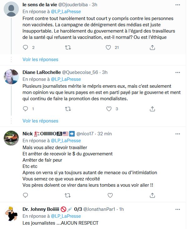 Est-ce que ce sont les mêmes journalistes qui traitent les gens d'édentés, complotistes, covidiots, touristata, anti-masques, anti-vax, récalcitrants, égocentriques, irresponsables, négationnistes, terroristes, fêlés, coucous, sous-éduqués, extrémistes, racistes, dangereux, bozos, crétins, tatas, danger public, égoïste et beaucoup d'autres qualificatifs du genre qui se plaignent? Les journalistes insultent et encouragent la haine envers ceux qui ne pensent pas comme eux depuis janvier 2019.
