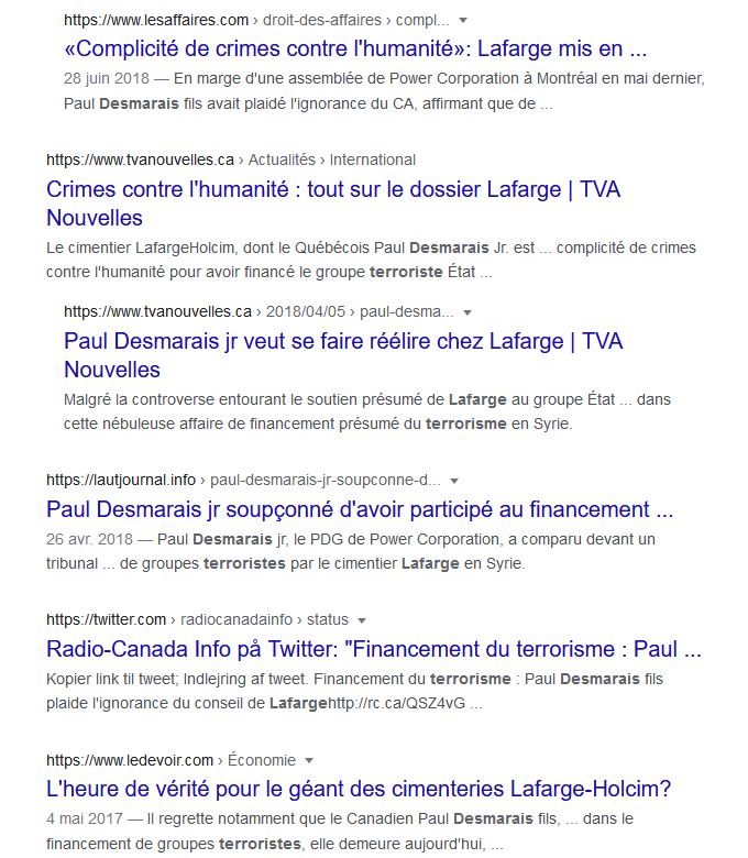 2018: Administrateur de LafargeHolcim, Paul Desmarais, jr, se retrouve sur la sellette, puisque l’entreprise est soupçonnée d’avoir participé au financement de groupes terroristes pour qu’ils permettent le maintien des activités d’une usine de ciment en Syrie.