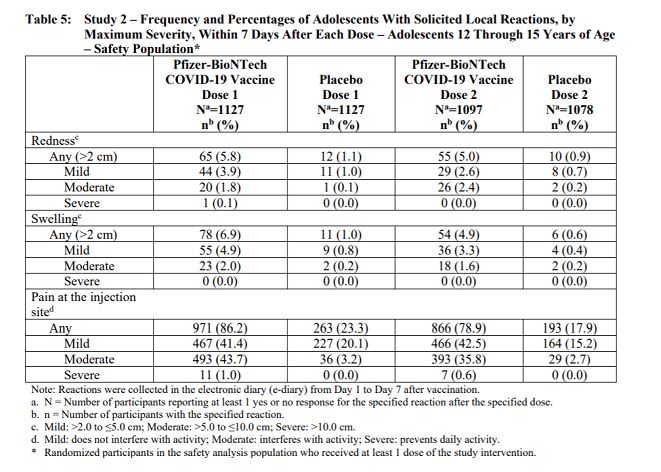 Cette fiche d'information contient le tableau suivant qui détaille le taux alarmant d'effets secondaires et de dommages subis par les enfants de 12 à 15 ans (c'est-à-dire les enfants) qui ont reçu les injections d'ARNm :