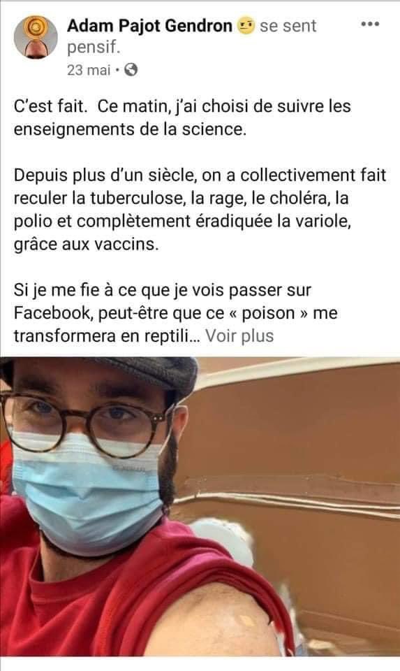 «Depuis plus d'un siècle , on à collectivement fait reculer la tuberculose, la rage, le choléra, la polio et complètement éradiquer la variole grâce aux vaccins, si je me fie à ce que je vois passer sur Facebook , peu-être que ce poison me transformera en reptilien».