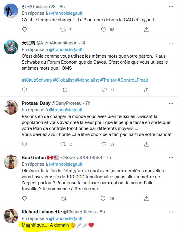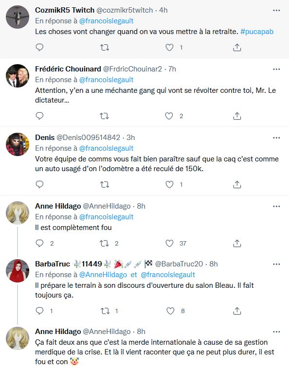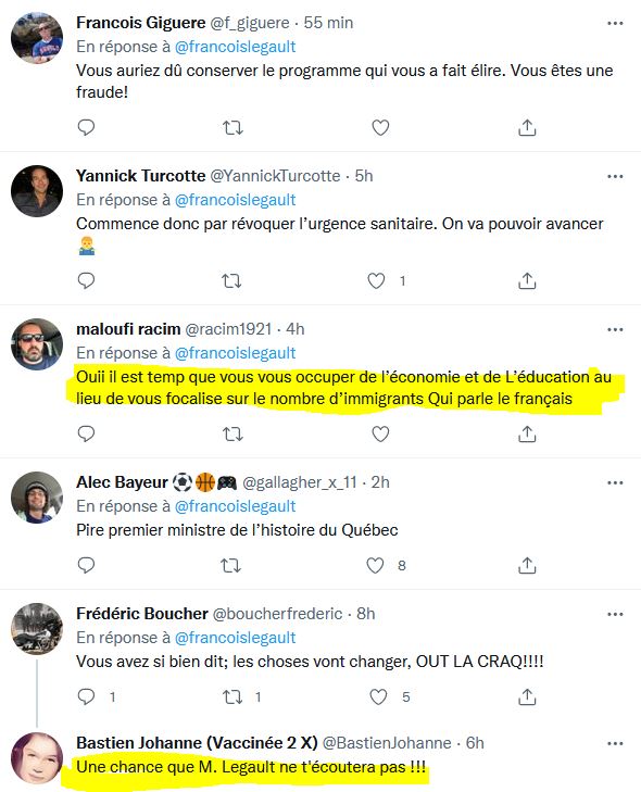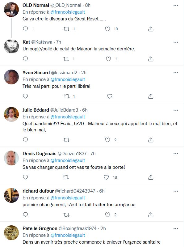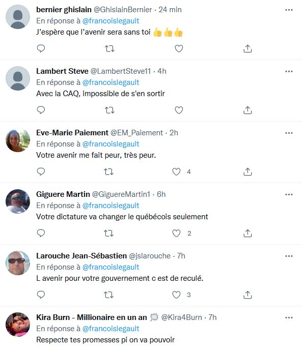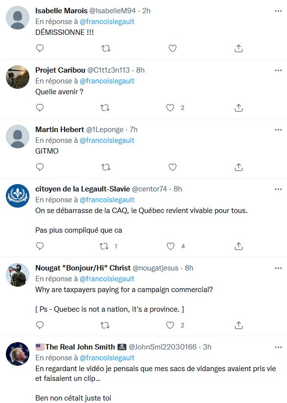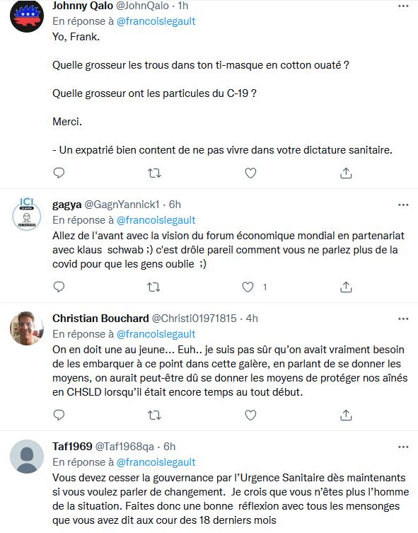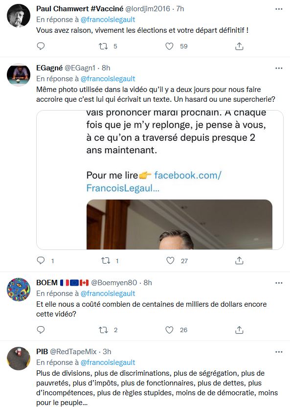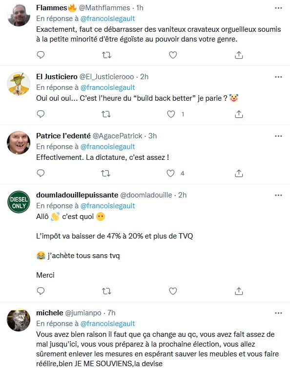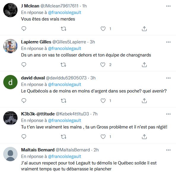 Comme je ne suis pas certain que cette publication va rester et surtout je n'ai aucune confiance à un entrepreneur qui est venu en politique pour se remplir les poches derrière avec les milliards de subvention versés à ses amis, j'ai fait des captures d'images des réponses laissés sur Twitter par Mme et M tout le monde QUI DÉMONTRENT QUE LES GENS NE SONT PAS SATISFAIT DE FRANÇOIS LEGAULT!