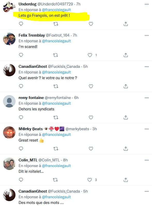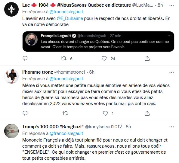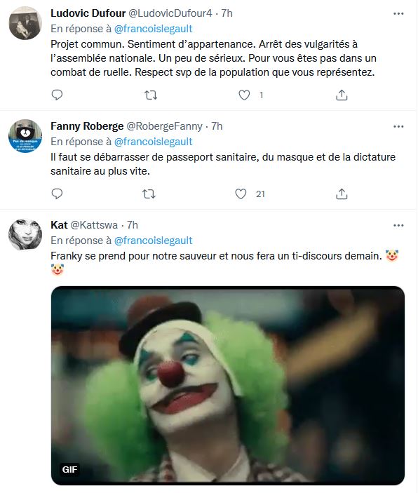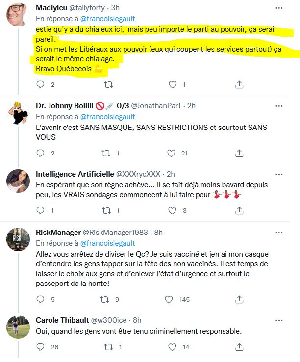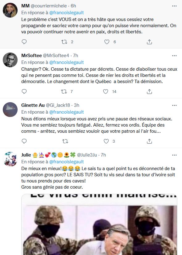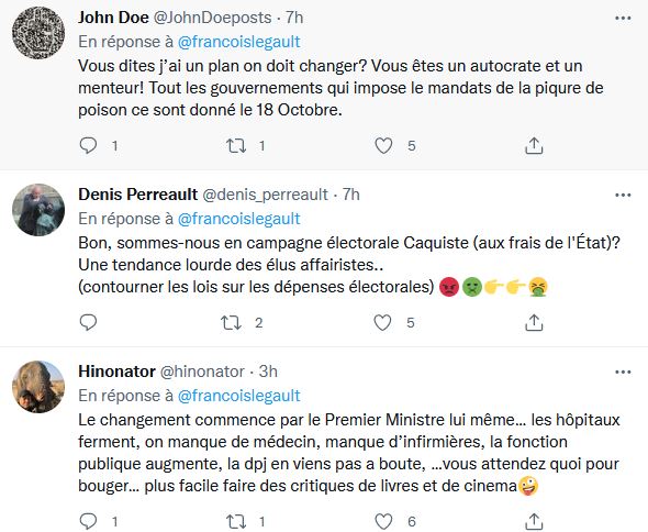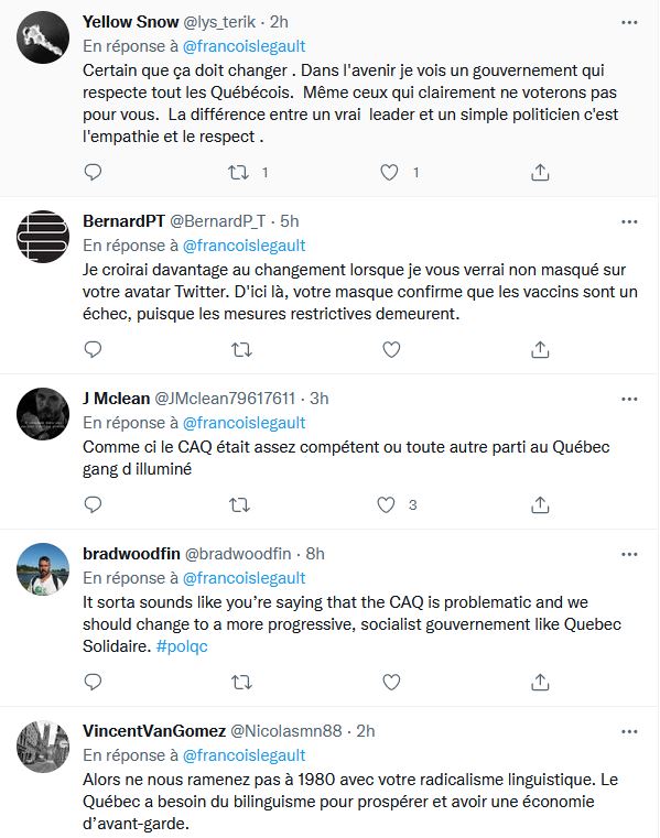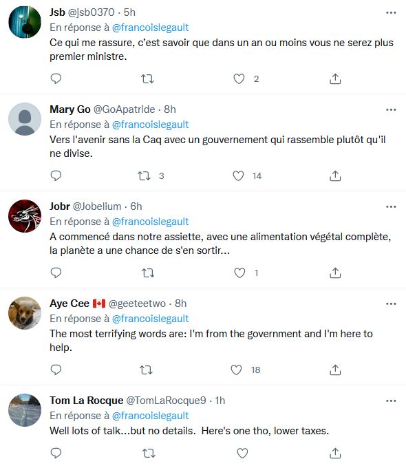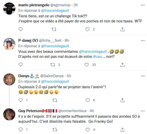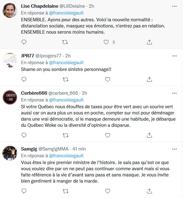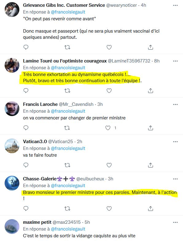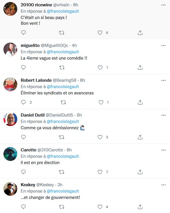 Comme je ne suis pas certain que cette publication va rester et surtout je n'ai aucune confiance à un entrepreneur qui est venu en politique pour se remplir les poches derrière avec les milliards de subvention versés à ses amis, j'ai fait des captures d'images des réponses laissés sur Twitter par Mme et M tout le monde QUI DÉMONTRENT QUE LES GENS NE SONT PAS SATISFAIT DE FRANÇOIS LEGAULT!