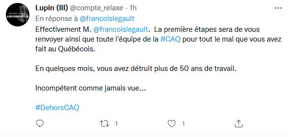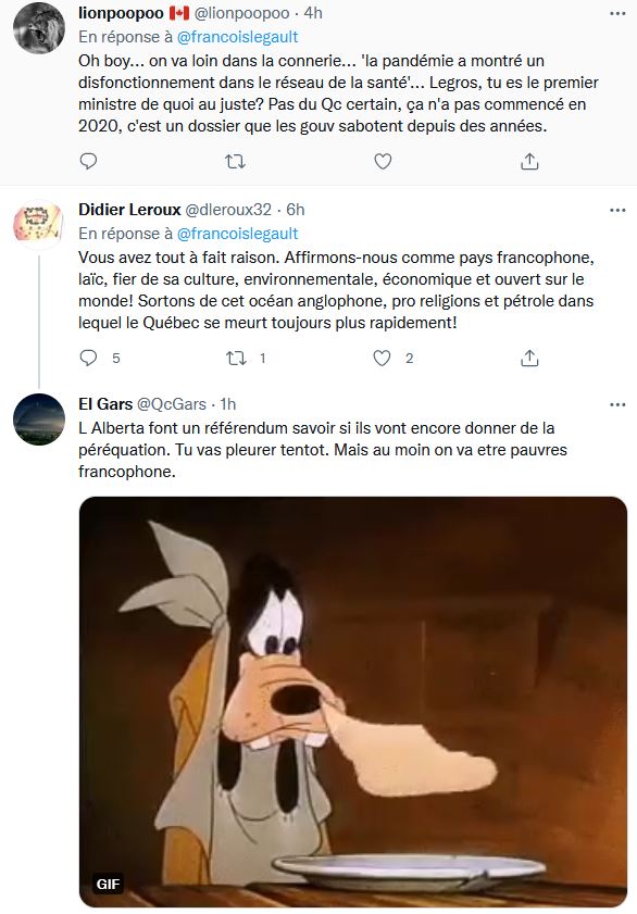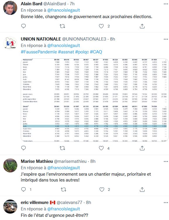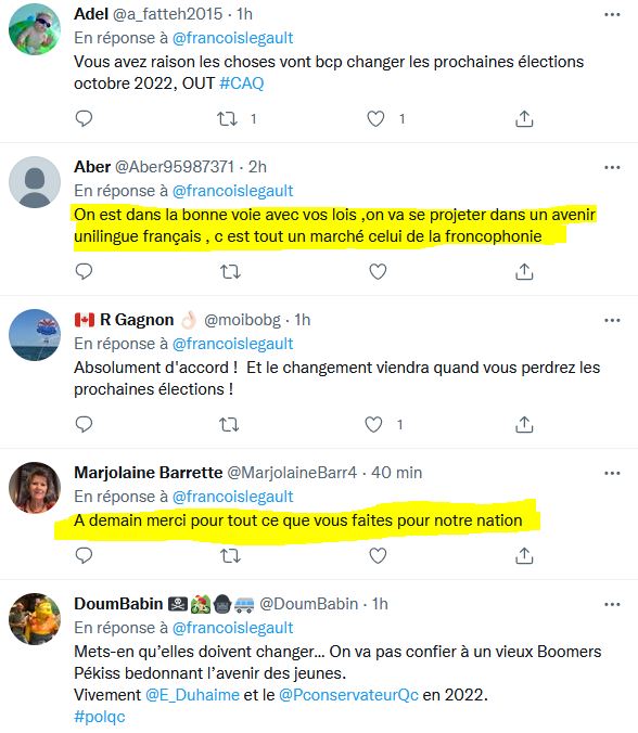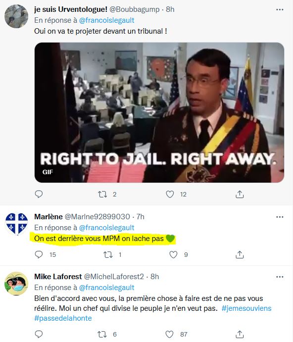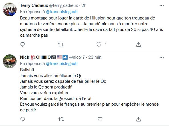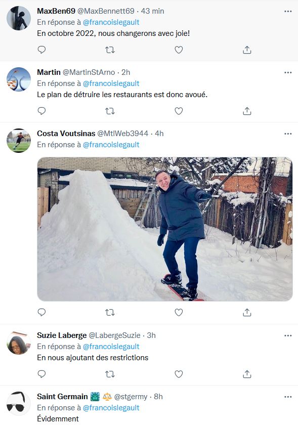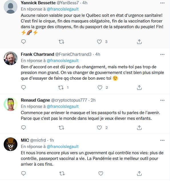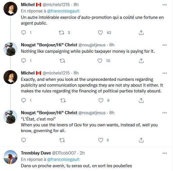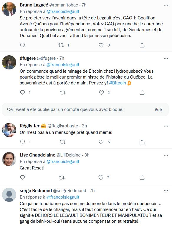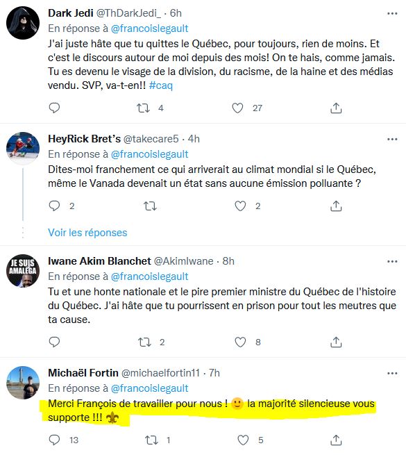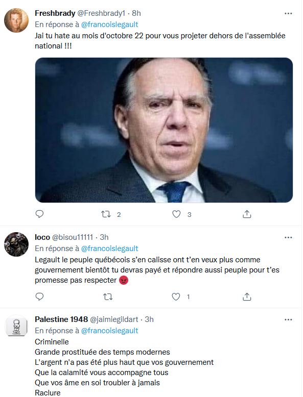 Comme je ne suis pas certain que cette publication va rester et surtout je n'ai aucune confiance à un entrepreneur qui est venu en politique pour se remplir les poches derrière avec les milliards de subvention versés à ses amis, j'ai fait des captures d'images des réponses laissés sur Twitter par Mme et M tout le monde QUI DÉMONTRENT QUE LES GENS NE SONT PAS SATISFAIT DE FRANÇOIS LEGAULT!