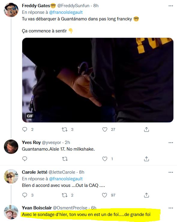 Présentement c'est 517 commentaires qu'il à reçu, seulement 200 peut être lus, (Twitter grand censeur, ne permet pas les autres) , quand on compare les mauvais commentaire à ceux de bons, on se demande d'ou viennent les gens de sondage Leger qui disent être pour La CAQ ?