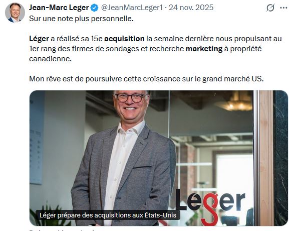 Léger a racheté entreprise après entreprise, enchaînant les acquisitions sans véritable débat public et sans le moindre souci du pluralisme. Désormais, cette même entreprise, qui bénéficie de contrats financés par l'argent du contribuable, pourra manipuler l'opinion publique exactement comme le souhaite le gouvernement. Non pas parce que les gens le pensent, mais parce que les sondages « montrent » ce qu'ils sont censés montrer. Quand les mêmes personnes collectent les données, les interprètent et les revendent au gouvernement, où est l'indépendance ?
